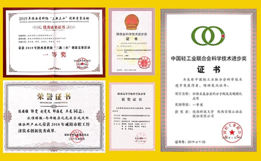 至此,我公司在水性醇酸乳液合成關(guān)鍵技術(shù)領(lǐng)域共獲得2019年“中國(guó)輕工業(yè)聯(lián)合會(huì)科技進(jìn)步一等獎(jiǎng)(部級(jí))、2019年陜西省科技進(jìn)步二等獎(jiǎng)、2019年陜西省三新三小創(chuàng)新競(jìng)賽一等獎(jiǎng)、2019年陜西省高等學(xué)??萍家坏泉?jiǎng)、2018年咸陽(yáng)市職工經(jīng)濟(jì)技術(shù)創(chuàng)新優(yōu)秀成果獎(jiǎng)”五項(xiàng)科技大獎(jiǎng)。實(shí)現(xiàn)了公司省部級(jí)科技大獎(jiǎng)歷史零的突破,并獲得被推薦申報(bào)國(guó)家科技進(jìn)步獎(jiǎng)的資格。